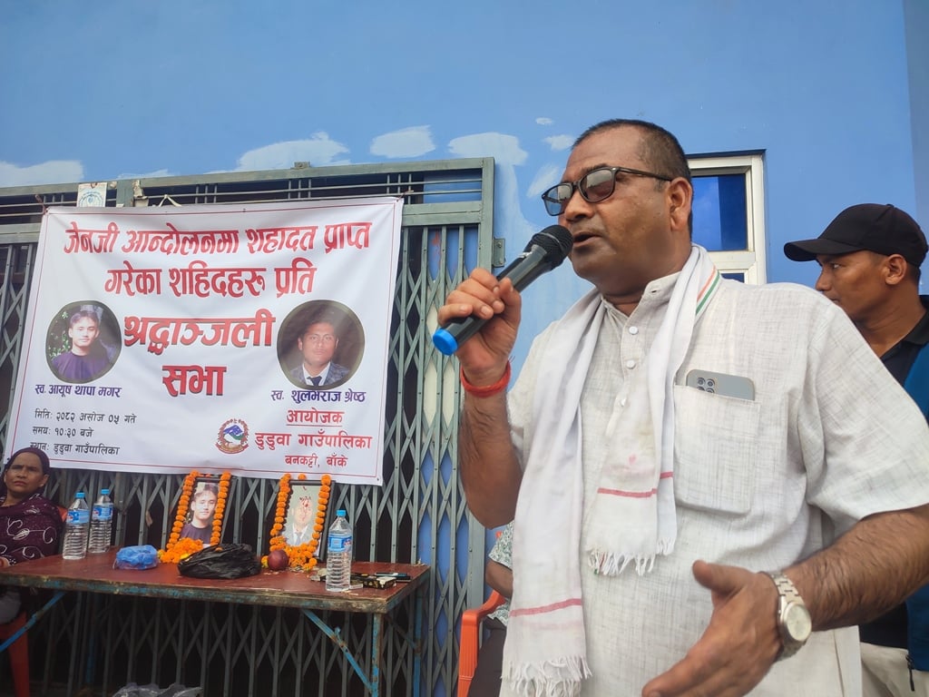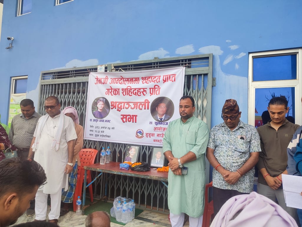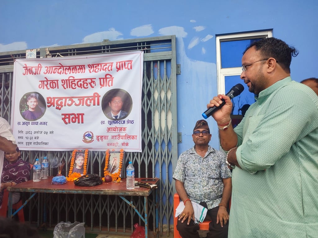 डुडुवा (बाँके), ५ असोज । डुडुवा गाउँपालिकाले जेनजी आन्दोलनका क्रममा ‘शहिद’ भएका नेपालगन्जका युवा स्वर्गीय शुलभराज श्रेष्ठ र आयुष थापासहित सहादत प्राप्त गरेका व्यक्तीहरुको सम्झनामा बृहत श्रद्धाञ्जली सभा गरेको छ ।