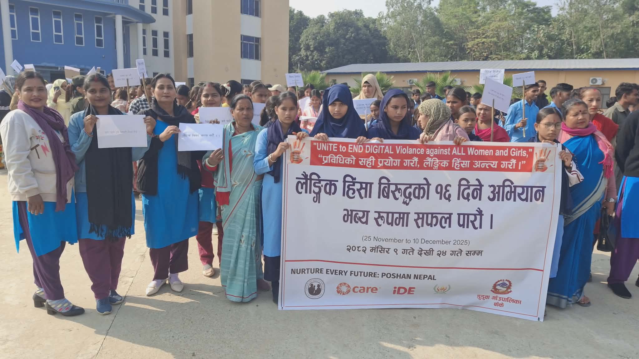 डुडुवा (बाँके), २४ मसिंर । लैङ्गिक हिंसाविरुद्धको १६ दिने अभियानको समापनमा बाँकेको डुडुवा गाउँपालिकाले सचेतनामुलक कार्यक्रम गरेको छ । गाउँपालिकाको ६ वटै वडाबाट रयालीसहित आएका महिलाहरुको समुहले लैङ्गिक हिंसाविरुद्ध सचेतनामुलक सन्देश प्रवाह गरेका छन ।