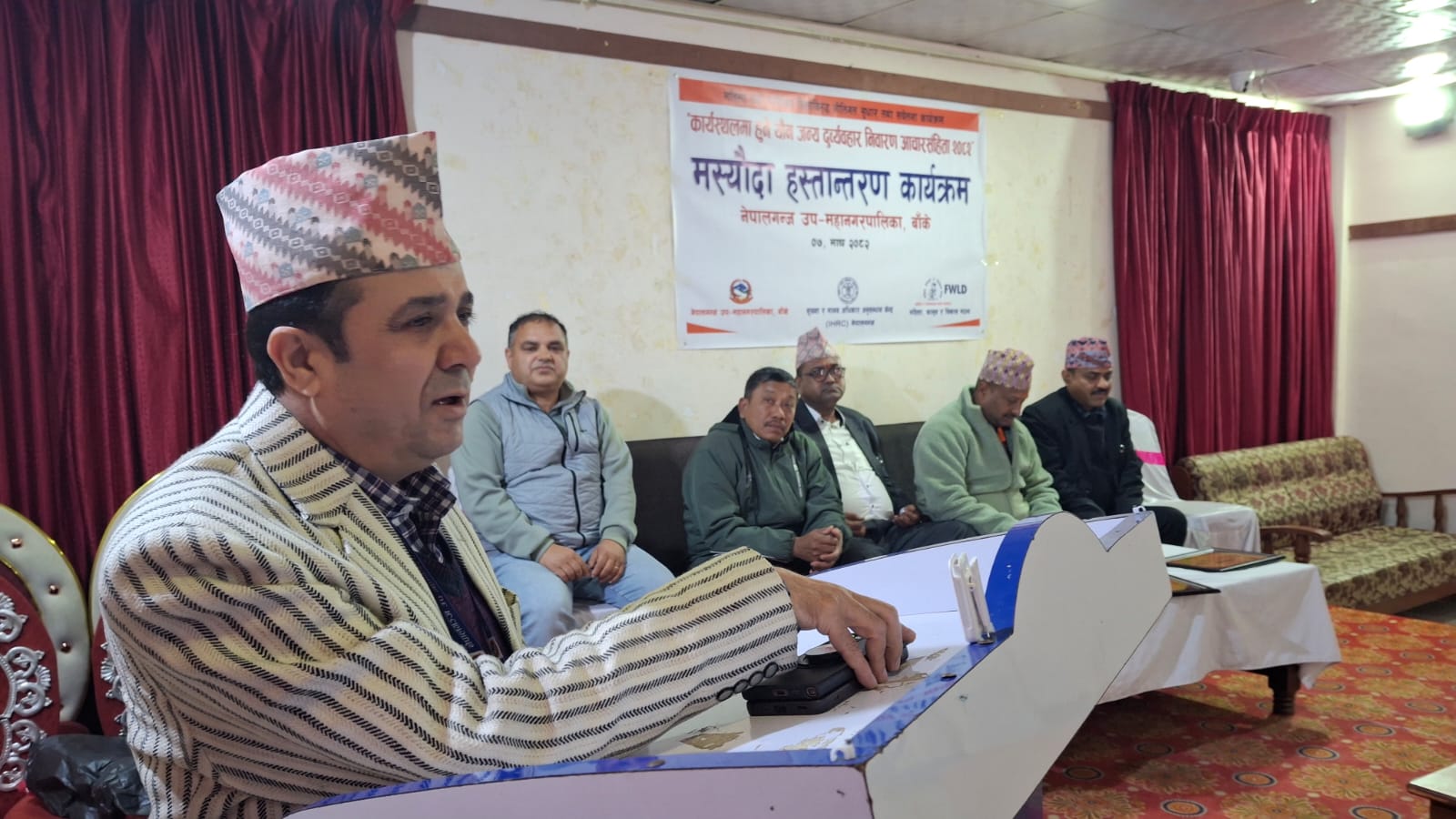 महिला, कानून र विकास मञ्च काठमाण्डौको सहयोगमा सूचना र मानव अधिकार अनुसन्धान केन्द्र नेपालगन्जको प्राविधिक सहयोगमा तयार गरिएको मस्यौदा कार्यान्वयनका लागि आज बुधबार एक कार्यक्रमका बीच हस्तान्तरण गरिएको हो ।