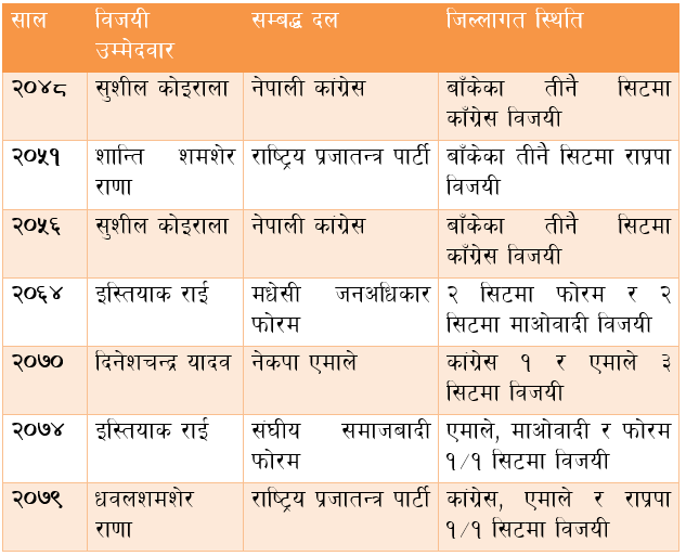 विगतका चुनावको समीक्षा गर्ने हो भने सुरुमा जिल्लाभर एउटै पार्टीले झण्डा गाडेको देखिन्छ । २०४८ सालको आमचुनावमा बाँकेका तीनै सिटमा नेपाली कांग्रेसले जित्यो । २०५१ मा जिल्लाका तीनै सिटमा राप्रपाले जित्यो । फेरि २०५६ मा कांग्रेसले तीनै सिटमा जित निकाल्यो ।